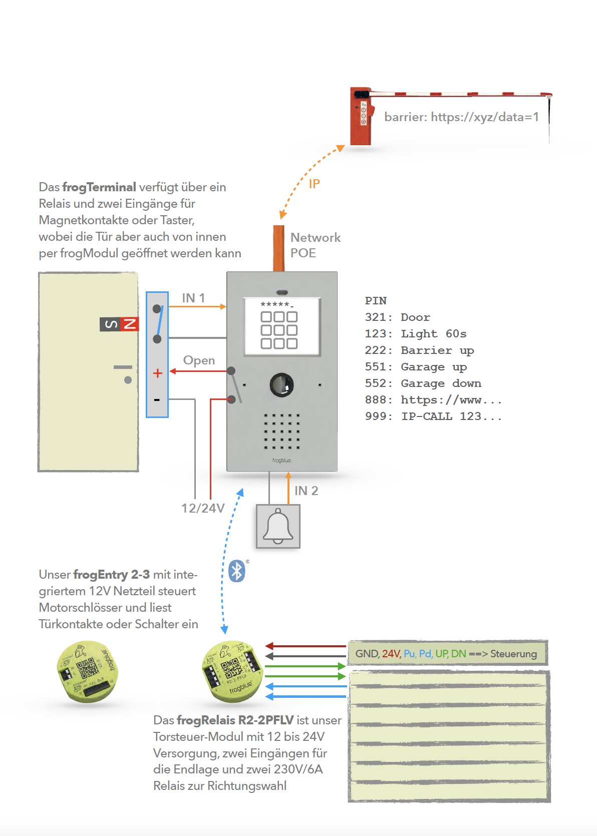 Le portier vidéo frogblue frogTerminal est directement basé sur le standard téléphonique mondial SIP intégré et supporte les scénarios multipartites jusqu'aux grands projets distribués. Sa force réside ici dans l'intégration simultanée de plusieurs systèmes téléphoniques SIP et serveurs SIP sans matériel supplémentaire.